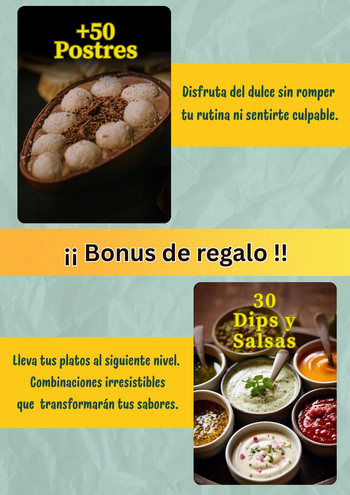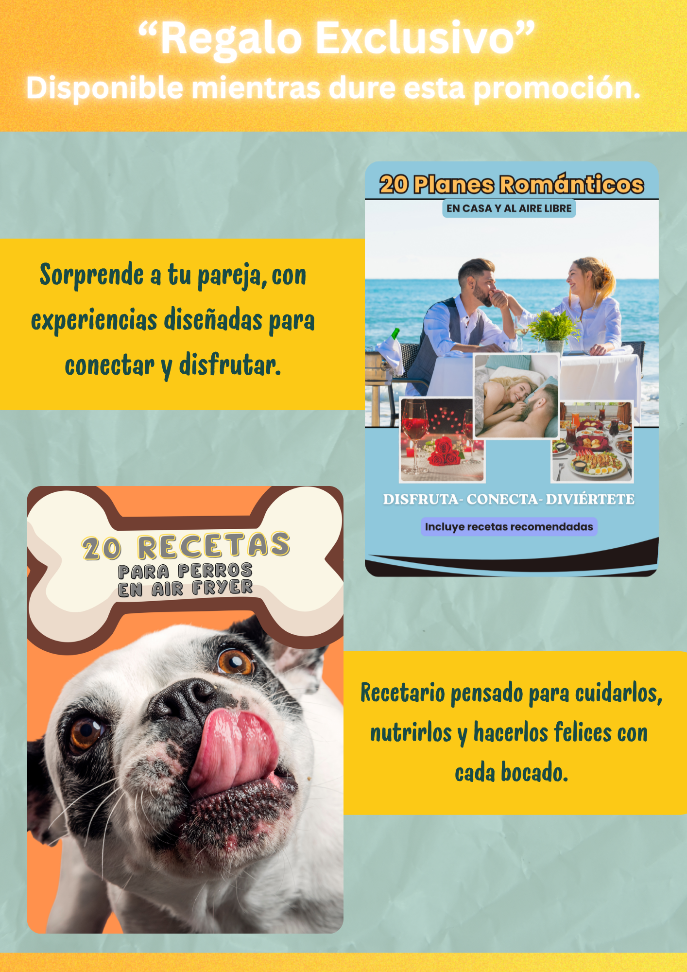 - ❤️ Extras únicos: dips y salsas, reset corporal, reset hormonal, planes románticos y recetas para perros
