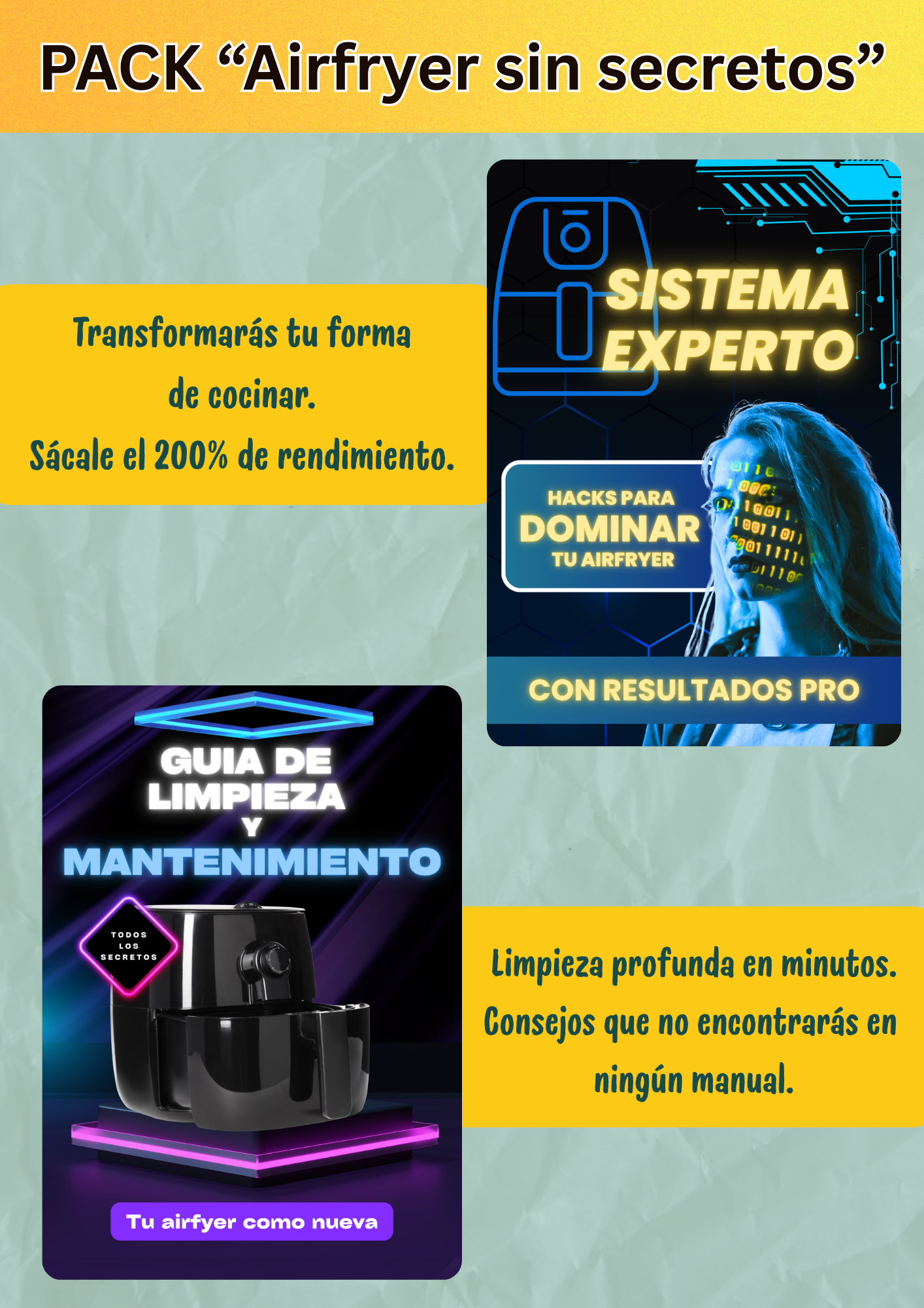 Recibes un pack digital completo descargable con más de 500 recetas para Air Fryer, organizado para que puedas cocinar fácil, rápido y sin complicaciones desde el primer día.
